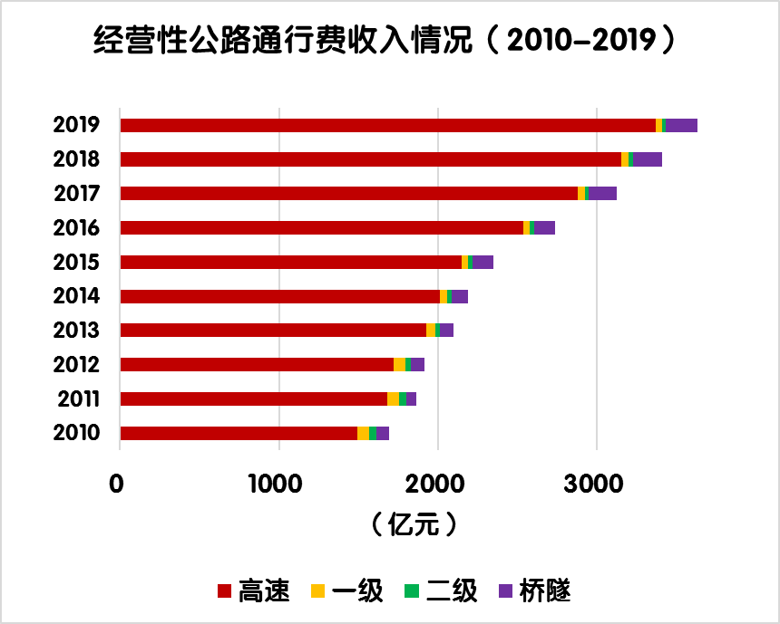 與上年相比,經營性公路車輛通行費總收入由3410.1億元增加到3628.9億元,凈增218.7億元,增長6.4%。其中,高速公路由3152.4億元增加到3368.1億元,凈增215.7億元,增長6.8%;一級公路由48.0億元減少到41.9億元,凈減6億元,下降12.6%;二級公路由25.4億元減少到23.5 億元,凈減1.9億元,下降7.6%;獨立橋梁及隧道由184.3億元增加到195.3億元,凈增11億元,增長6.0%。