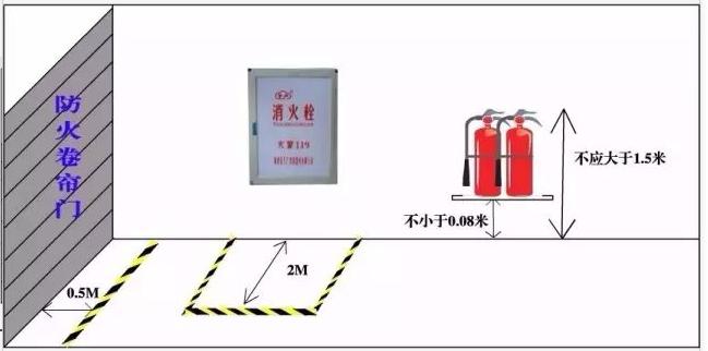 防火卷簾門兩側各0.5m范圍內不得堆放物品,并應用黃色標識線劃定范圍?!度藛T密集場所消防安全管理》(GA654-2006)8.3.7