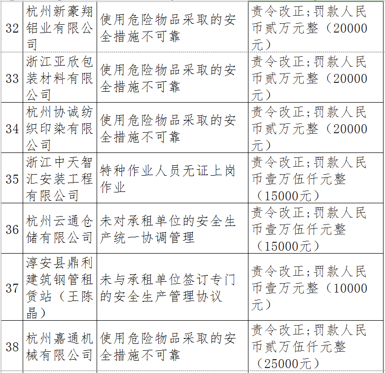 據了解,今年上半年,杭州市應急管理局一手抓駐企復工復產、一手抓安全生產,已完成年度執法計劃、專項檢查、聯合執法、信訪舉報核查等,并對檢查中發現的安全生產違法違規企業(個人)進行了處罰。現對52家被行政處罰的企業(個人)進行曝光,希望各企業引以為戒!
