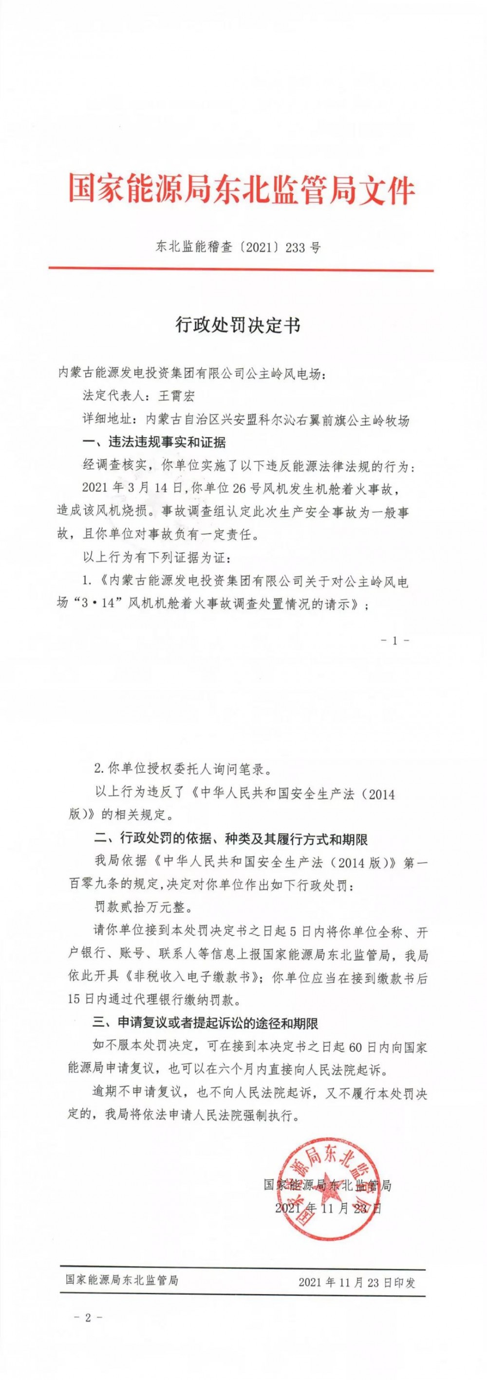 記者獲悉,11月23日,國家能源局東北監管局通報關于公主嶺風電場“3·14”風機機艙著火事故行政處罰決定書,依據《中華人民共和國安全生產法(2014版)》第一百零九條的規定,決定對內蒙古能源發電投資集團有限公司進行罰款20萬元整。