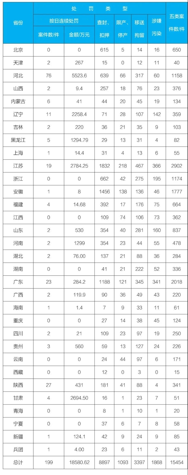 2021年1-12月,全國五類案件總數(shù)為15454件。其中,按日連續(xù)處罰案件數(shù)量為199件,罰款金額為18580.62萬元;適用查封、扣押案件數(shù)量為8897件;適用限產(chǎn)、停產(chǎn)案件數(shù)量為1093件;移送拘留案件數(shù)量為3397件;移送涉嫌環(huán)境污染犯罪案件數(shù)量為1868件。