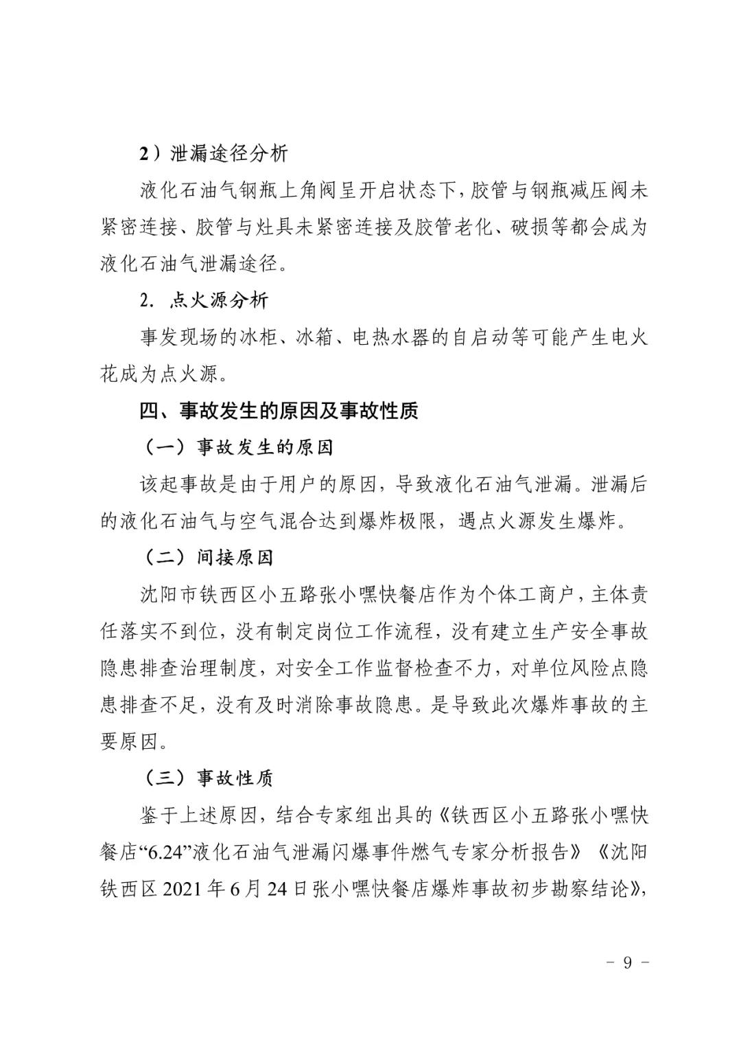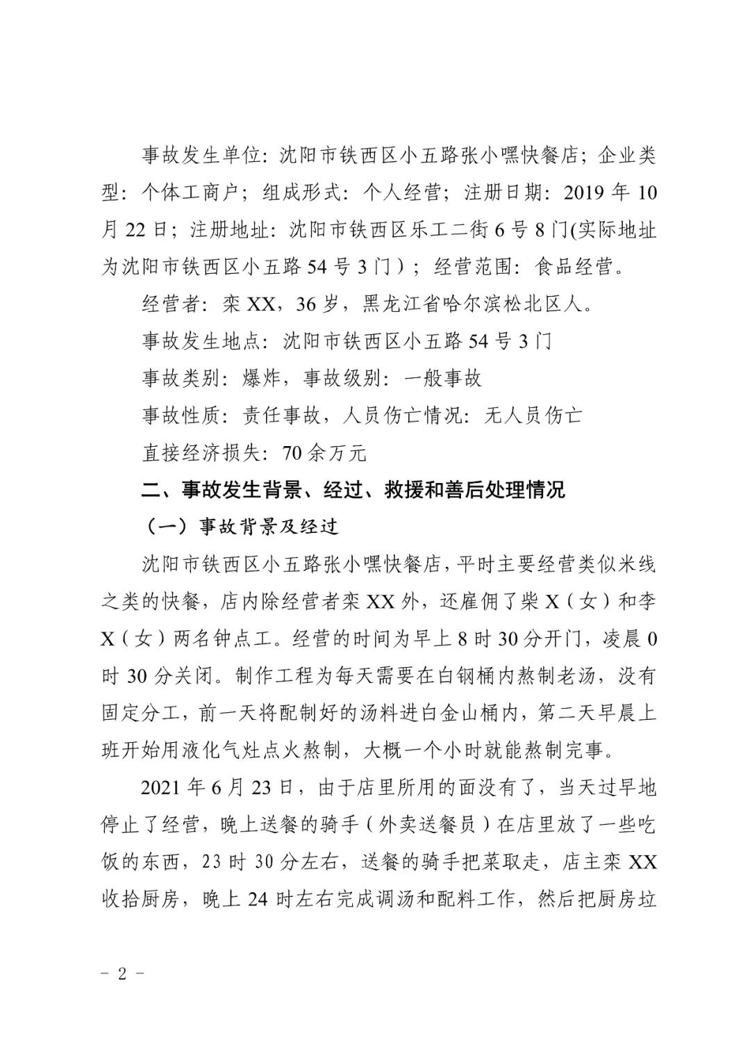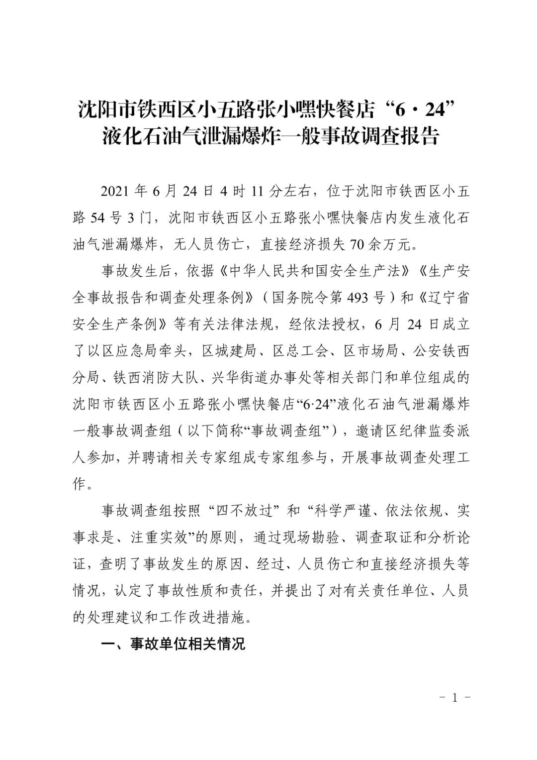 2021 年 6 月 24 日 4 時(shí) 11 分左右,位于沈陽市鐵西區(qū)小五路 54 號 3 門,沈陽市鐵西區(qū)小五路張小嘿快餐店內(nèi)發(fā)生液化石油氣泄漏爆炸,無人員傷亡,直接經(jīng)濟(jì)損失 70 余萬元。