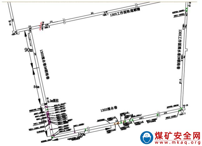 事故當班,綜掘隊和防沖項目部在 1303 工作面泄水巷及 3 號聯絡巷施工。