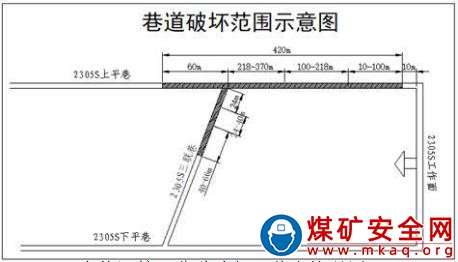 經現場勘查,事故區域為 2305S 工作面上平巷自上端頭 10m 以外 420m,三聯巷 66m,合計 486m(見圖 1)。根據巷道破壞程
