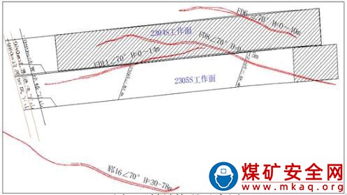 面斜交,正斷層,實際揭露落差 10~15m,傾角 70°,傾向 NW,走向 NE,斷層在工作面延展長度 720m。該斷層落差自北向南呈逐漸增大的趨勢,對工作面開采影響較大。
