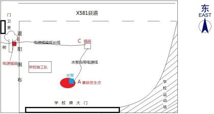 約9時,馮建威先到達現(xiàn)場查看情況,協(xié)調(diào)借用抽水泵和處理其他維修點工作。隨后,薛柏林、趙文輝駕駛工程車到達耕管村附近,將一些工具和材料送給附屬施工隊【1】后,約9時20分到達該爆水管處。兩人經(jīng)商量決定先抽走水坑里的水再檢查和維修水管。薛柏林駕駛工程車向附近(約500米外)作業(yè)的附屬施工隊借回一臺潛水泵(規(guī)格為3寸220V)和一根普通電源插座延長線,回來后將潛水泵放進水坑中。趙文輝和薛柏林向?qū)W校維修項目工地(靠學校操場跑道側(cè))借用臨時用電,將連接潛水泵的電源插座延長線插在工地施工用的排插上,啟動后發(fā)現(xiàn)潛水泵不運行,兩人徒手搖晃潛水泵并調(diào)整插頭,發(fā)現(xiàn)潛水泵仍不運行。經(jīng)詢問現(xiàn)場施工人員及剛好經(jīng)過的學校保安林建軍,得知樹下還有一處借電點,保安林建軍未經(jīng)請示校領(lǐng)導同意擅自協(xié)助兩人將電源插座延長線直接插到樹上排插上,此時潛水泵還是不運作,趙文輝和薛柏林懷疑潛水泵可能有故障或者是有雜物堵塞。約9時45分,趙文輝走向C處查看插頭是否松動時,薛柏林則用雙手徒手檢查潛水泵故障,不慎發(fā)生觸電。此時,馮建威已回來在一旁與上橫中心小學的張志老師交談,突然聽到薛柏林發(fā)出“觸電”的叫聲,隨即跌倒在地,雙腳落入水坑中。趙文輝立馬拔掉潛水泵自帶電源線的插頭,薛柏林掙扎爬到水坑邊臉朝下趴在地上,臉色發(fā)白,處于昏迷狀態(tài)。