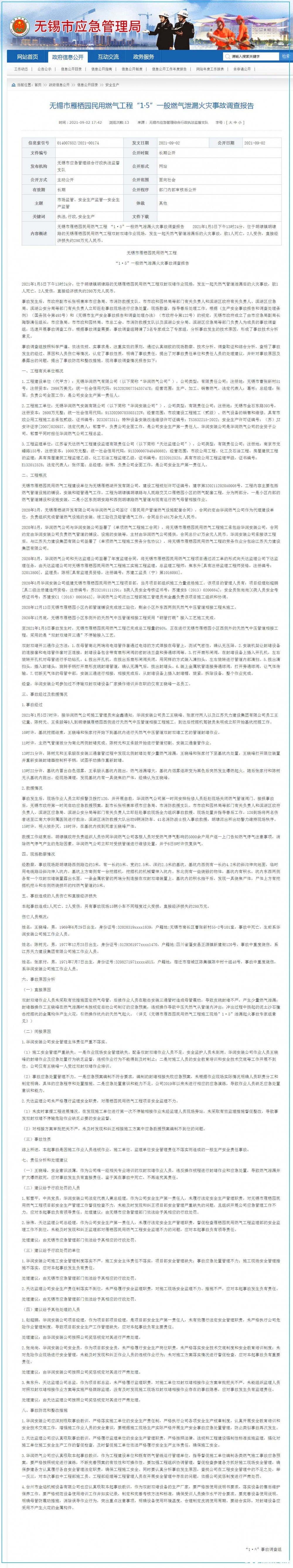 9月2日,無錫市應急管理局網站公布無錫市雁棲園民用燃氣工程“1·5”一般燃氣泄漏火災事故調查報告。報告顯示,2021年1月5日下午13時24分,位于胡埭鎮胡埭路的無錫雁棲園民用燃氣工程雙封雙堵作業現場,發生一起天然氣管道泄漏后的火災事故,致1人死亡,2人受傷,直接經濟損失約280萬元人民幣。本起事故是因施工作業人員違規作業,施工單位、監理單位安全管理責任不落實而造成的一般生產安全責任事故。