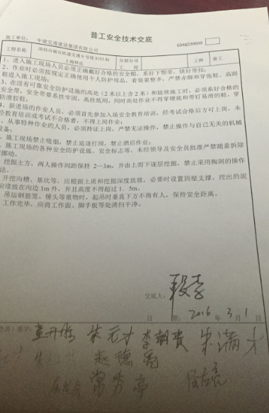2016年3月5日,深圳城市軌道交通9號線BT項目9103-1標上梅林站1號風亭南側基坑2名作業人員(屈龍虎、屈應亮)對距離地面約1.6米左右的地連墻進行植筋鉆孔作業。