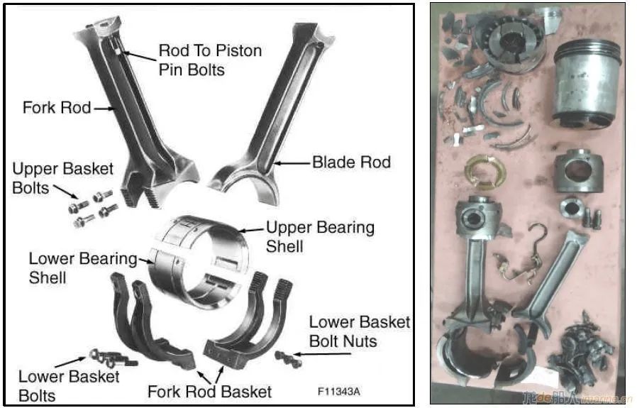 在檢查中,工程師發現6號曲柄銷(用于6號和14號氣缸)的連桿和活塞處于“完全損壞狀態”。在油底殼中發現曲柄總成托架的一個完整螺栓,同時在另外一處發現了緊固螺母,這證明螺栓和螺母是在運行過程中脫落的??偝傻钠渌菟ň捎诶爝^度而發生變形及斷裂。